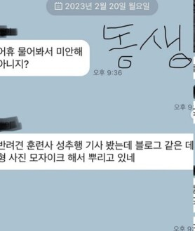 인스타그램에 동생과 나눈 카카오톡 메시지 대화 내용 사진을 공개하며 동생은 강형욱에게 "물어봐서 미안해 아니지?"라고 물은 뒤 "반려견 성추행 기사 봤는데 블로그 같은데 형 사진 모자이크해서 뿌리고 있다"라고 알렸습니다.