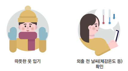 - 외출 시 내복이나 얇은 옷을 겹쳐 입고 장갑·목도리·모자·마스크를 착용