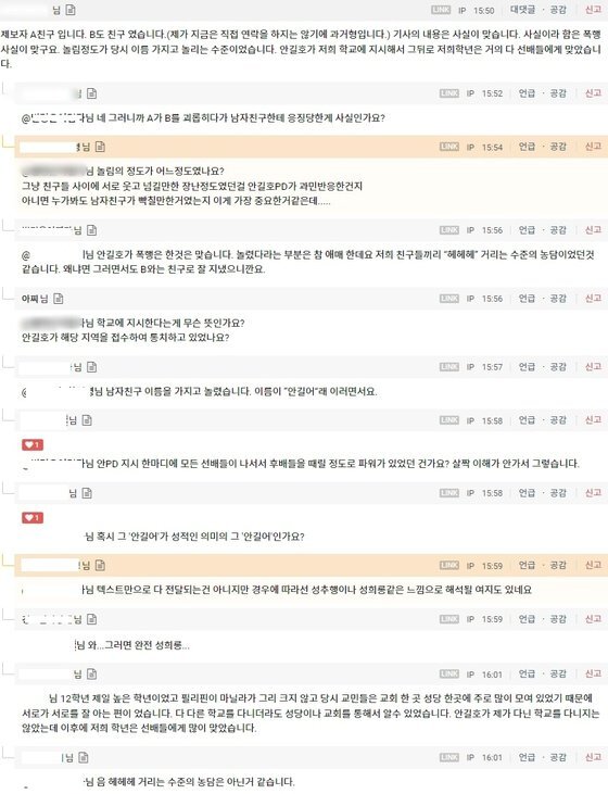 이에 안길호 PD는 '필리핀에서 1년여간 유학을 한 것은 맞지만 한인 학생들과 물리적인 충돌에 엮였던 기억은 없다'라고 관련 사실을 부인했습니다. 또 '전혀 그런 일이 없었다. 아무리 생각해도 누군가를 무리 지어 때린 기억은 없다'라고 말했습니다.