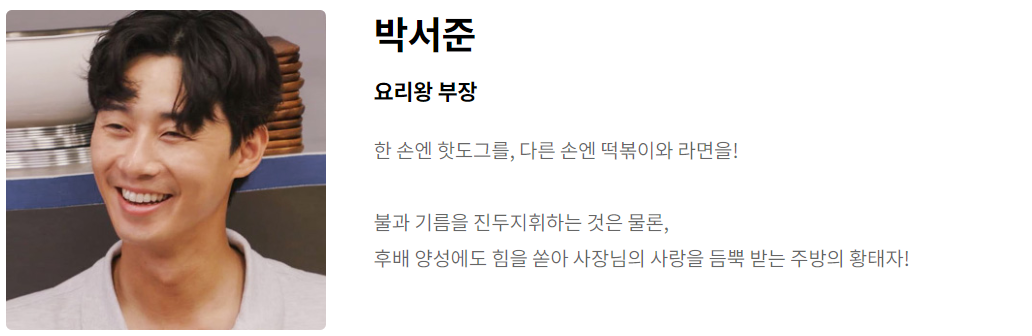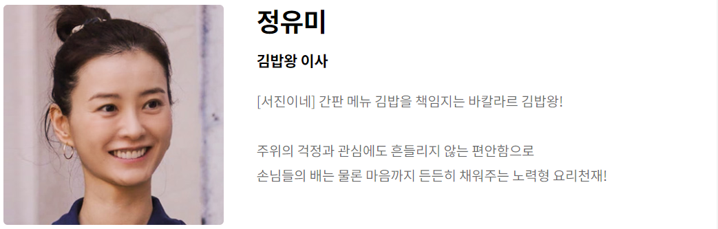 누구보다 식당 경영에 진심인 사장 이서진, 이사로 승진한 정유미, 주방의 실세로 거듭난 부상 박서준, 아직은 인턴인 최우식, 정직원 자리를 노리는 새 인턴 방탄소년단 뷔(김태형)이 출연합니다.
