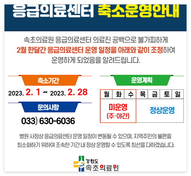 이번 달부터 강원도 속초의료원 응급실이 단축운영에 들어갔습니다. 이유는 응급실 전문의 5명 중 2명이 지난 달에 퇴사하면서 응급실을 주4회만 운영하고 있습니다. 또 이번 말 퇴사 의사를 밝힌 전문의가 1명이 더 있어 충원되지 않으면 더욱 축소될 전망입니다