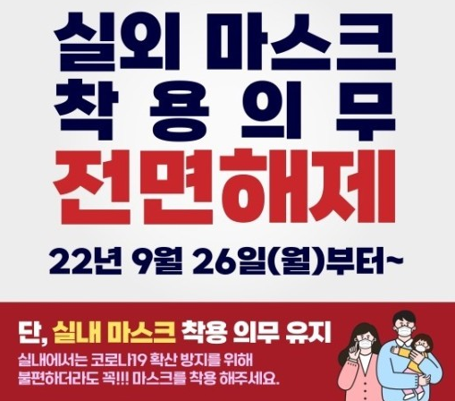 2022년 9월 26일부터 규제보다 권고에 기반한 방역 수칙 준수 생활화를 나가기 위해 실외 마스크 착용의무를 해제하고 착용 권고로 전환했습니다. 또한 과태료가 부과되는 의무 조치를 완화하여 국민의 자율적 결정에 따라 실외 마스크 착용을 선택하게 하는 것으로, 의무상황이 아니더라도 아래의 경우에는 실외 마스크 착용을 적극적으로 권고하고 있습니다.
