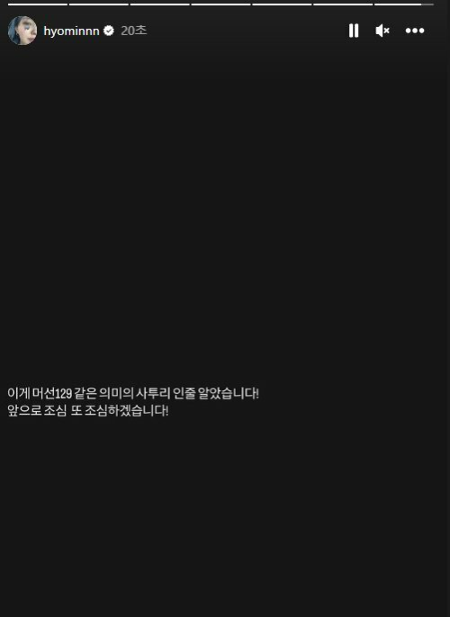 해당 게시물이 논란이 되자, 효민은 게시물을 삭제 후 새로운 인스타그램 스토리를 올려 "이게 머선129 같은 의미의 사투리인 줄 알았습니다! 앞으로 조심 또 조심하겠습니다!"라고 해명했습니다. 효민은 평소 자신의 SNS를 통해 일상을 공개하면서 팬들과 소통하고 있습니다.