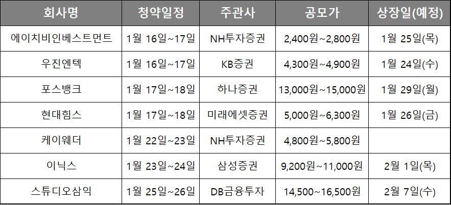 1월 공모주 청약일정입니다.