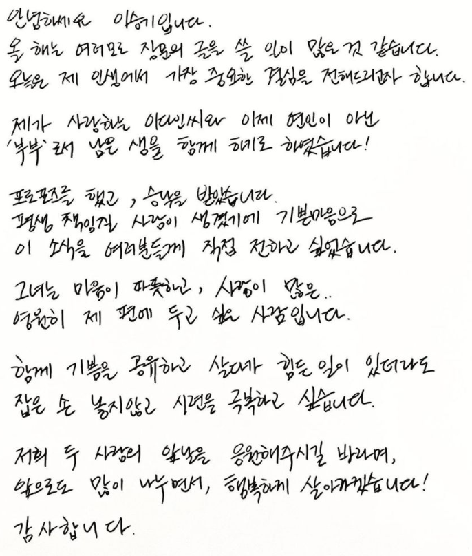이다인 측 또한 이 날 “이다인이 이승기와 든든한 동반자로서 소중한 연을 맺게 됐다. 영원히 서로의 편이 될 두 사람의 앞 날에 따뜻한 축복과 격려 부탁드린다.”며 결혼 소식을 전했습니다. 2021년 5월 열애를 인정한 후 2년 여 만에 이다인과 결혼을 직접 발표했습니다.